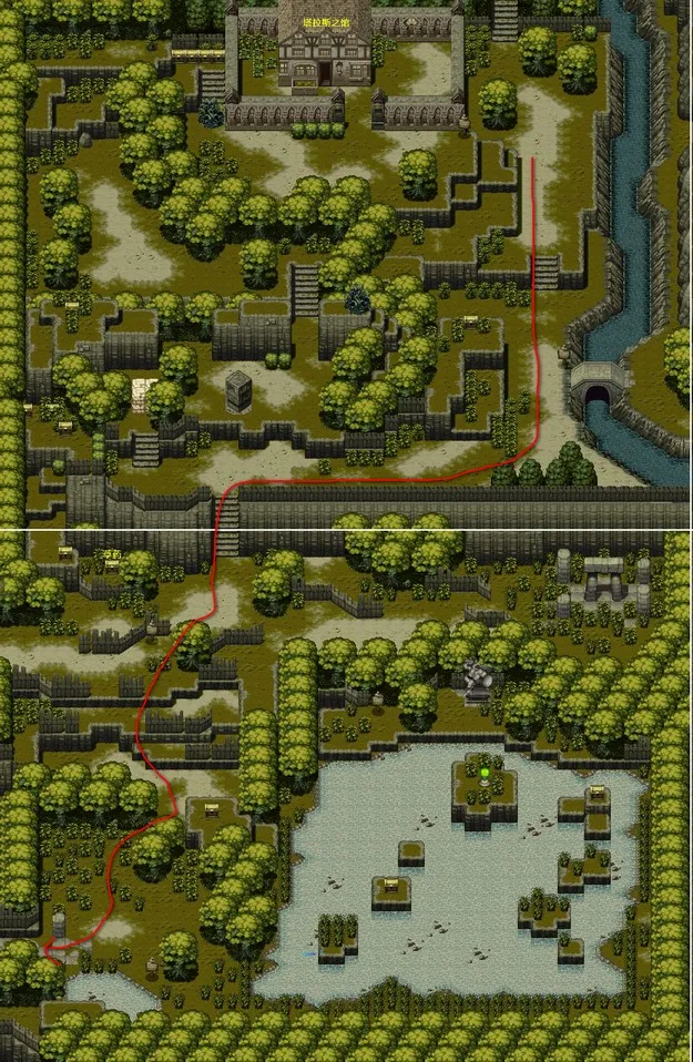 出村后一路向东,在水车小屋向下后来到塔拉斯之馆。(这时可以先不发展剧情,直接一路向南,来到沼泽西边的位置获得黄金鸟)