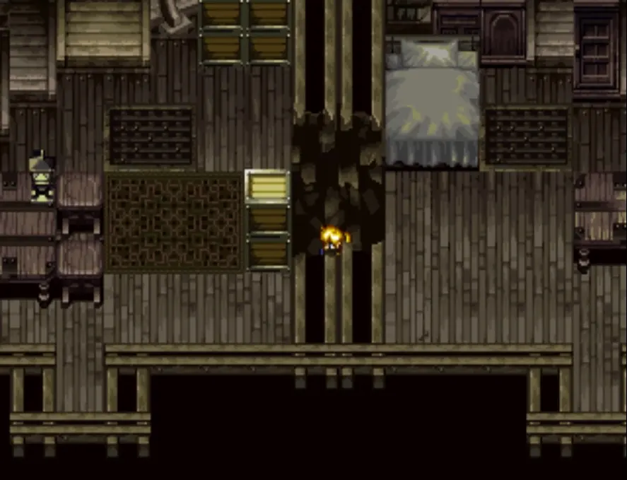 在这个房间需要将四周的四个木桶压在上面的四个机关上能开启吊门,开启吊门后的宝箱内有黄金鸟,但是要注意落下的铁球。