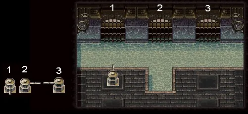 进入下个房间后打开机关沿着水路来到有3个门的房间,按照提示打开门先进入2号门开宝箱,再来到3号门踩下四周的机关,中间石台前的平台落下,打开宝箱获得钥匙。